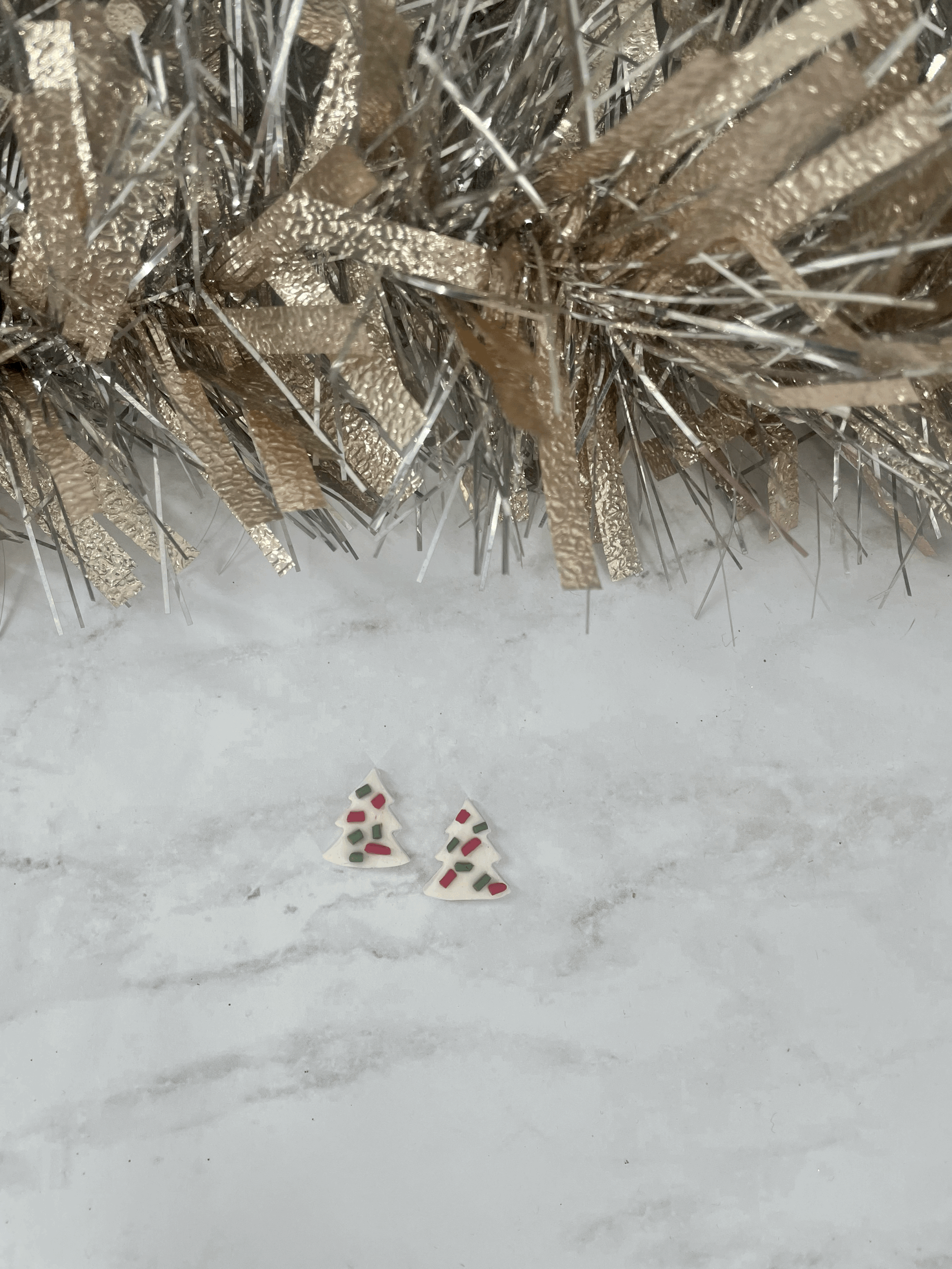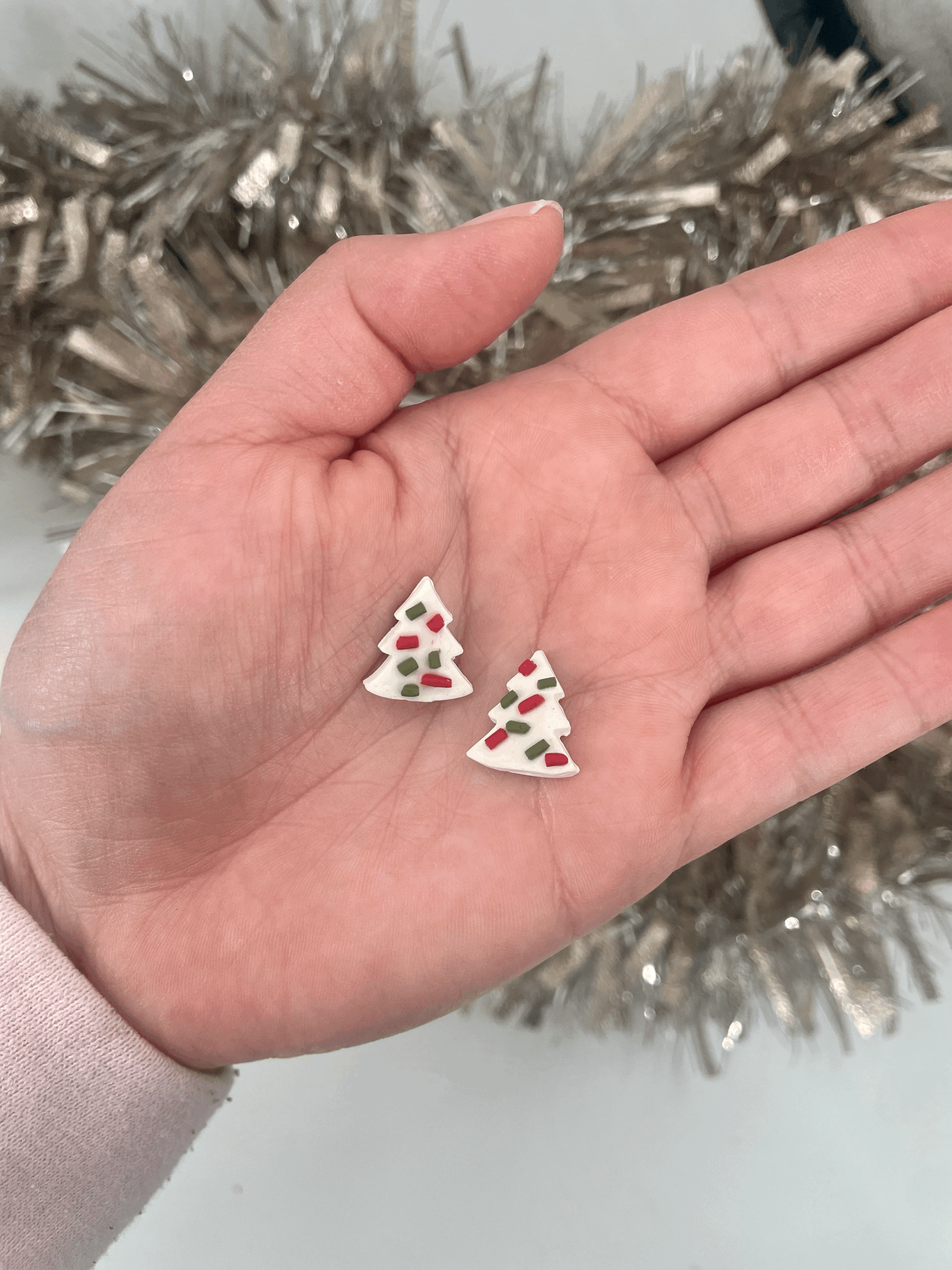 Hand created by me, these little Debbie inspired tree studs are set on hypoallergenic gold earring backs. Tested on extremely sensitive ears with no issues!